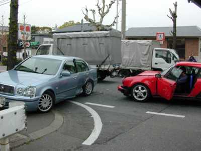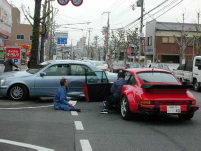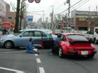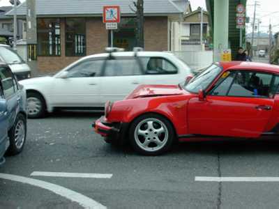部屋にいると、ドーンというものすごい音がしたので、窓から覗いて見たら、家の前で、真っ赤なポルシェ911カレラが、ベンツに似た車(車名わかりません)に突っ込んで破損していました。