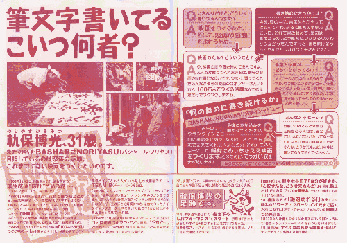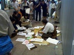 なんか、若い兄ちゃんが、地面に座り込んで、筆で字を書いてるの。