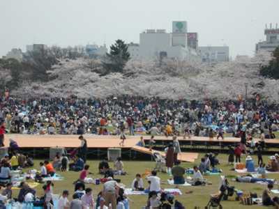 桜の下にシート引いて、みんな弁当食べたり、酒飲んで踊ったりしている。