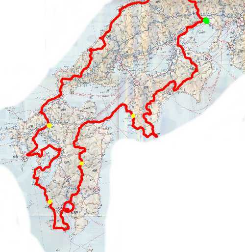 予定のコース (黄丸は宿泊予定)
