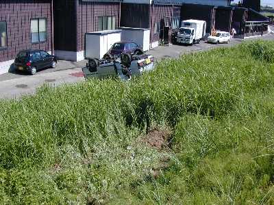 鶴岡から酒田に入ろうかというところで、わたしの前を走っていた軽四のワンボックスが、 いきなり片輪走行になったあと、弧を描くように左に進路をとり、そのまま崖下に転落し、最後は真逆さまになる、そんな事故になりました。